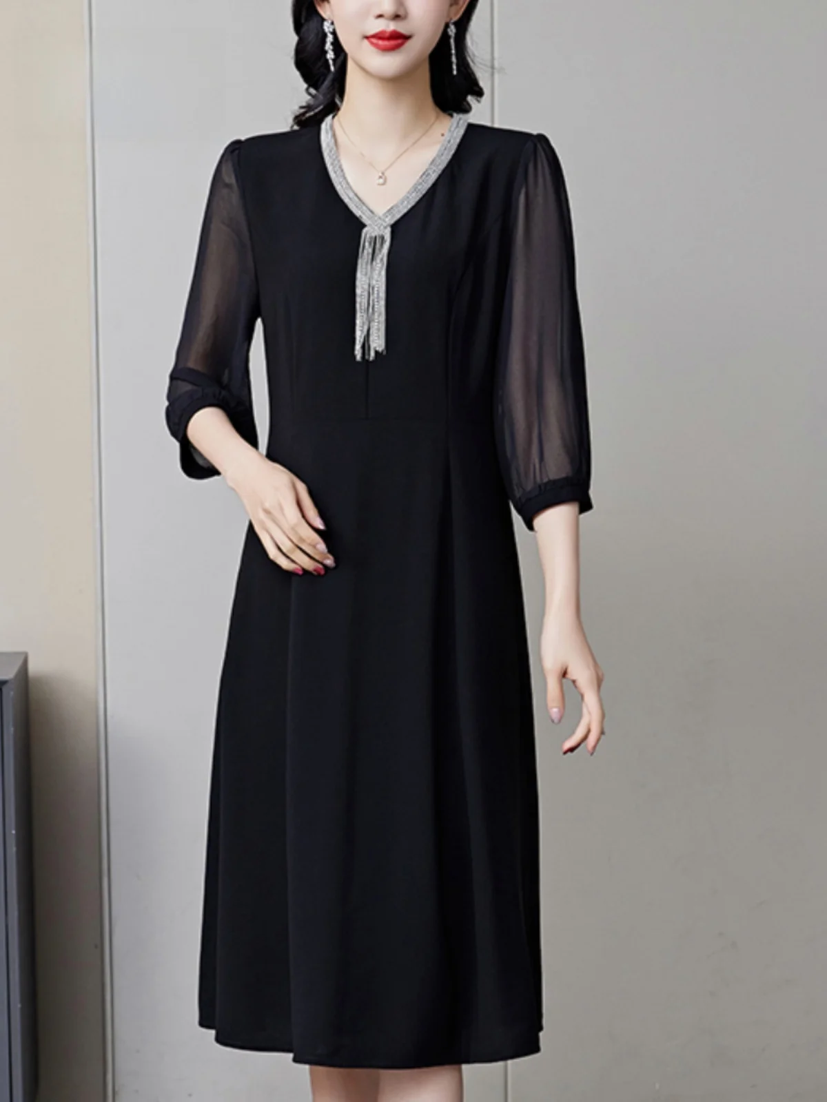 Schickes, mittellanges Chiffon-Kleid von Dr. Keisman, Frühlingsneuheit, modisches Mutterkleid für Frauen mittleren Alters, koreanischer Stil, lockere Passform, V-Ausschnitt