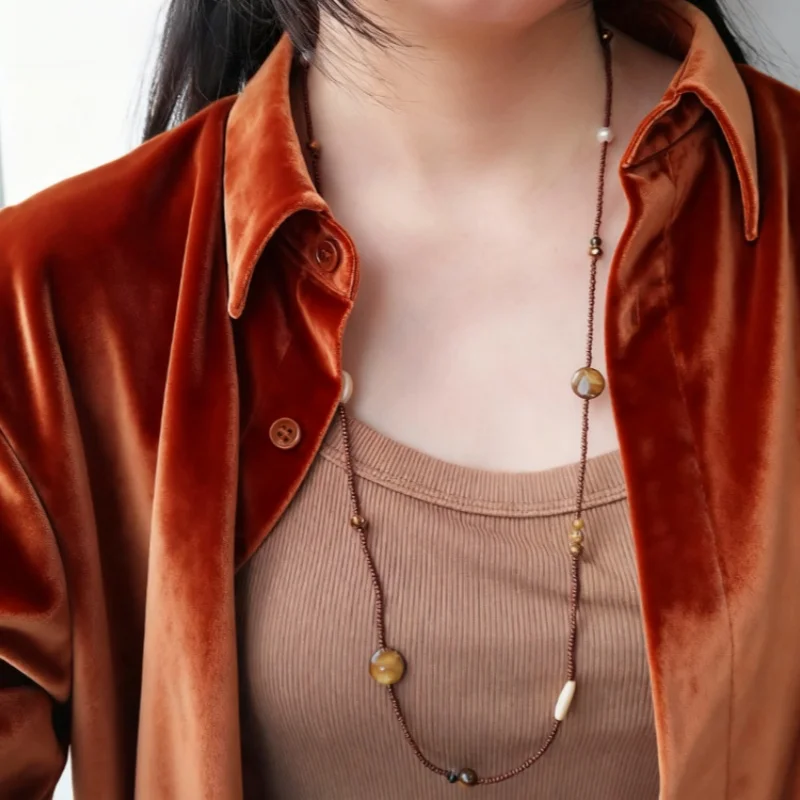 Lange handgemachte Halskette für Frauen Herbst und Winter neue Maillard-Farbe Muschel Perlen Pullover Kette Schmuck mit Geschenktüte