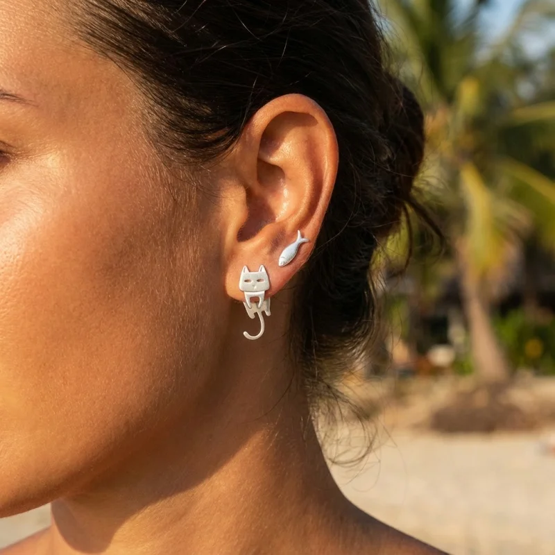 Rinhoo Einfache Temperament Asymmetrische Ohrstecker für Frauen Niedliche Tier Katze Fisch Ohrring Täglichen Verschleiß Schmuck Geschenk