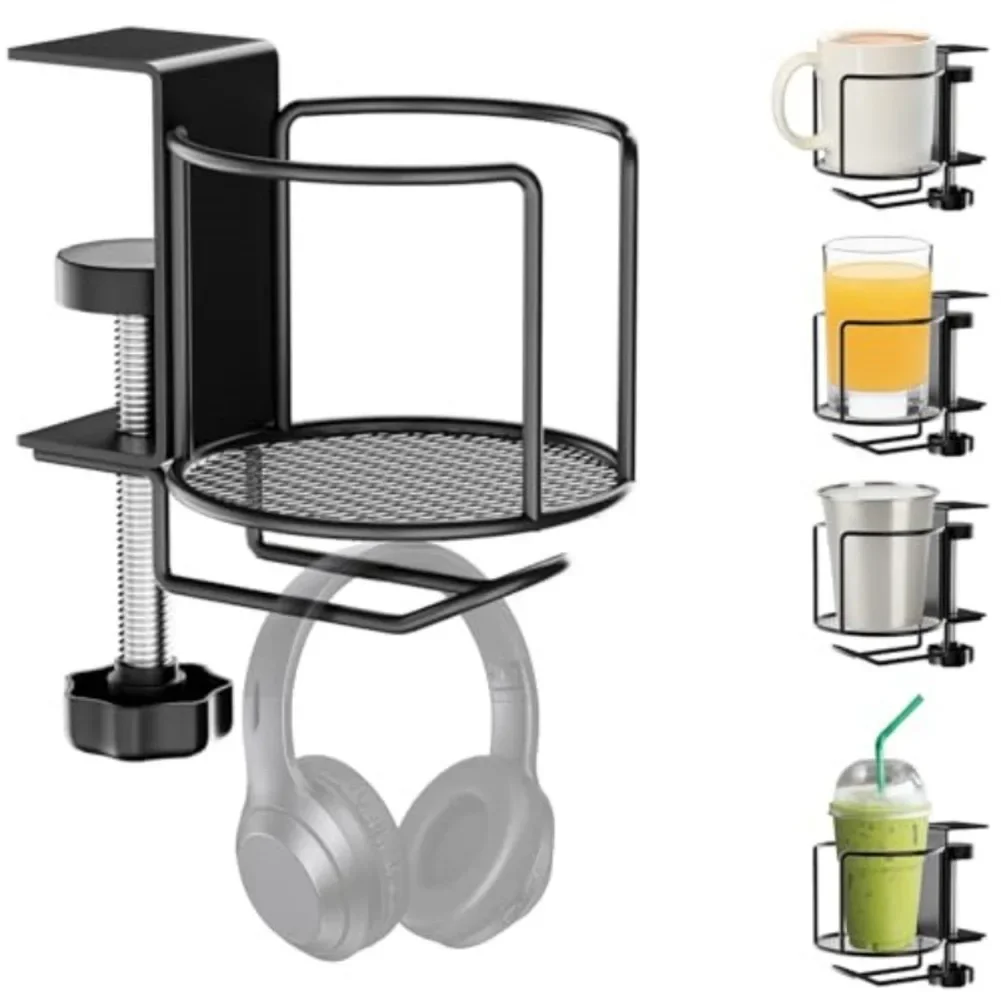2-in-1 Verstellbarer Schreibtisch-Getränkehalter, Anti-Verschüttungs-Flaschenhalter, Tischklemme, Getränkehalter mit Kopfhörerhalterung