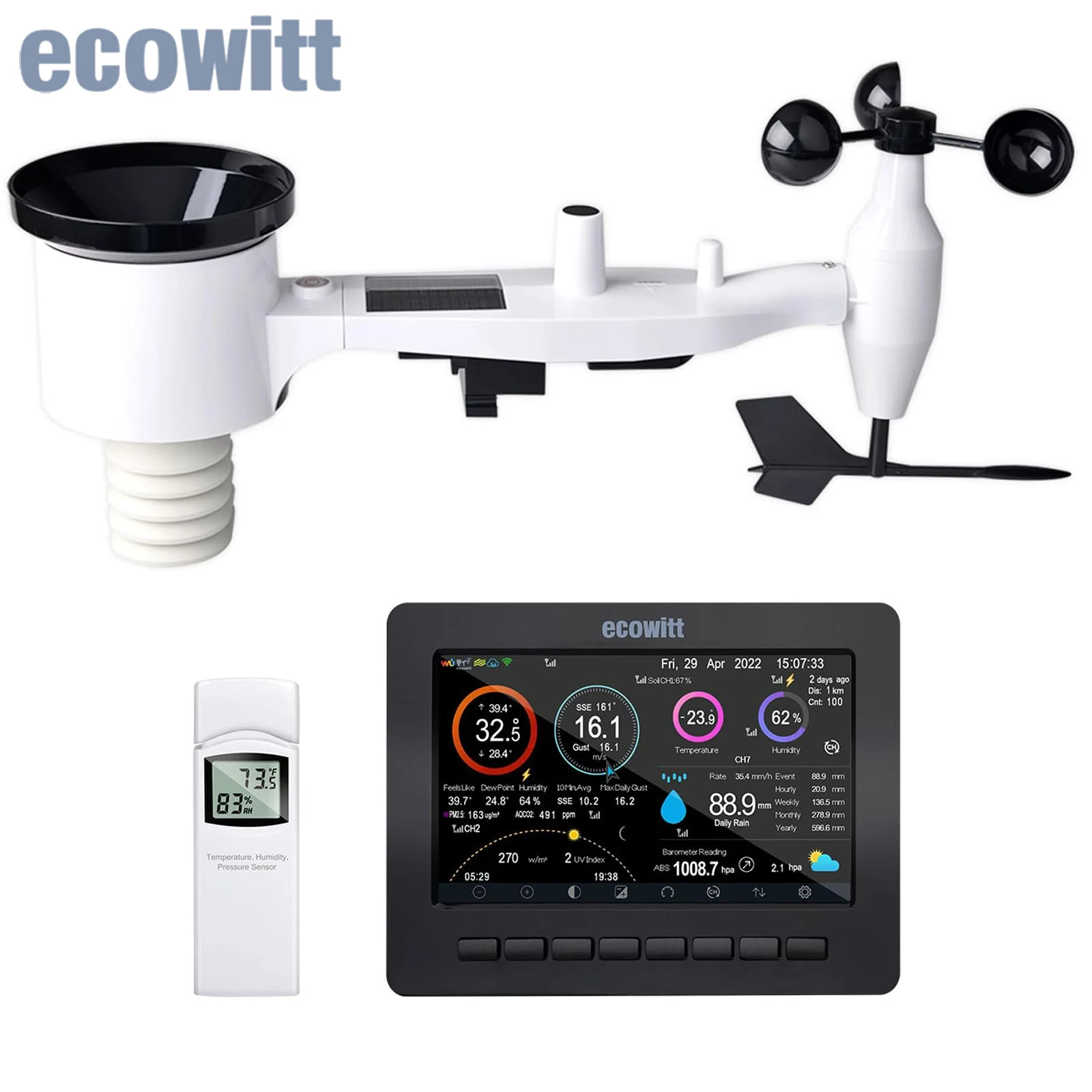 Ecowitt HP2551 WLAN-Wetterstation mit 7'' Großem TFT-Farbdisplay, 7-in-1 Solarbetriebener Außenwettersensor