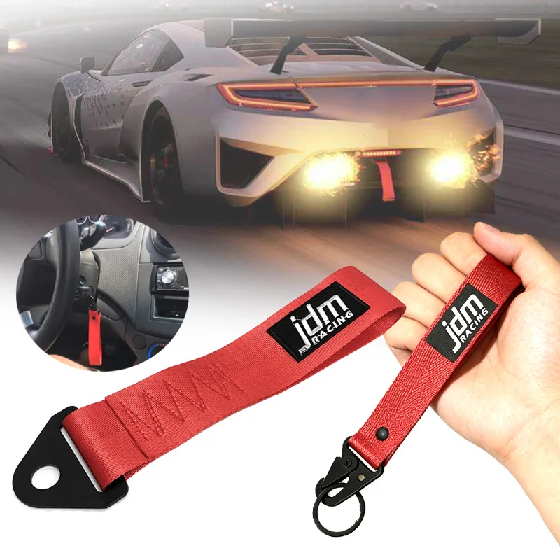 1 Stück Hochfester Nylon-Abschleppgurt und 1 Stück Handgelenkschlaufe für Autoschlüssel, JDM RACING Abschleppgurt für vordere und hintere Stoßstange, Dekorativer Anhängergurt