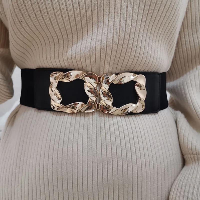 Goldfarbener Gürtel mit quadratischer Schnalle für Damen, breiter dekorativer Außenbereich mit Rock, Pullover-Gürtel, elastisch, einfach, passend zu der Taille, schwarz