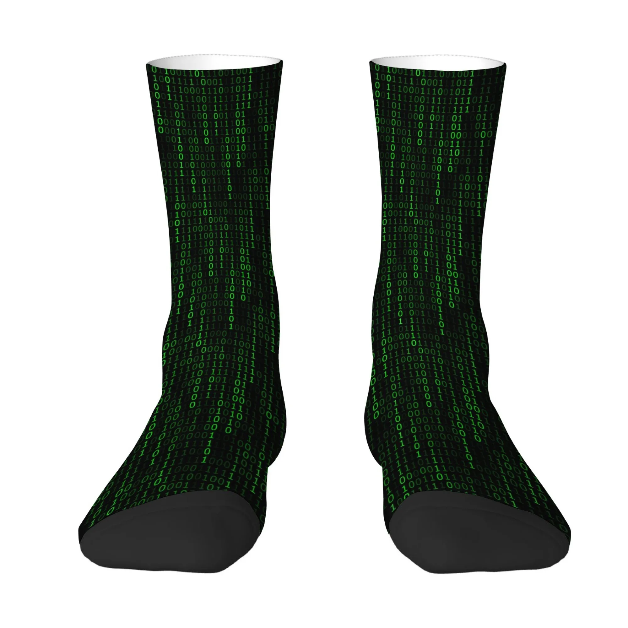 Hacker-inspirierte Design-Socken bis zur Mitte der Wade mit Binärcode-Aufdruck und grünem Digital-01-Code-Muster im Cyberpunk-Stil für IT-Programmierer