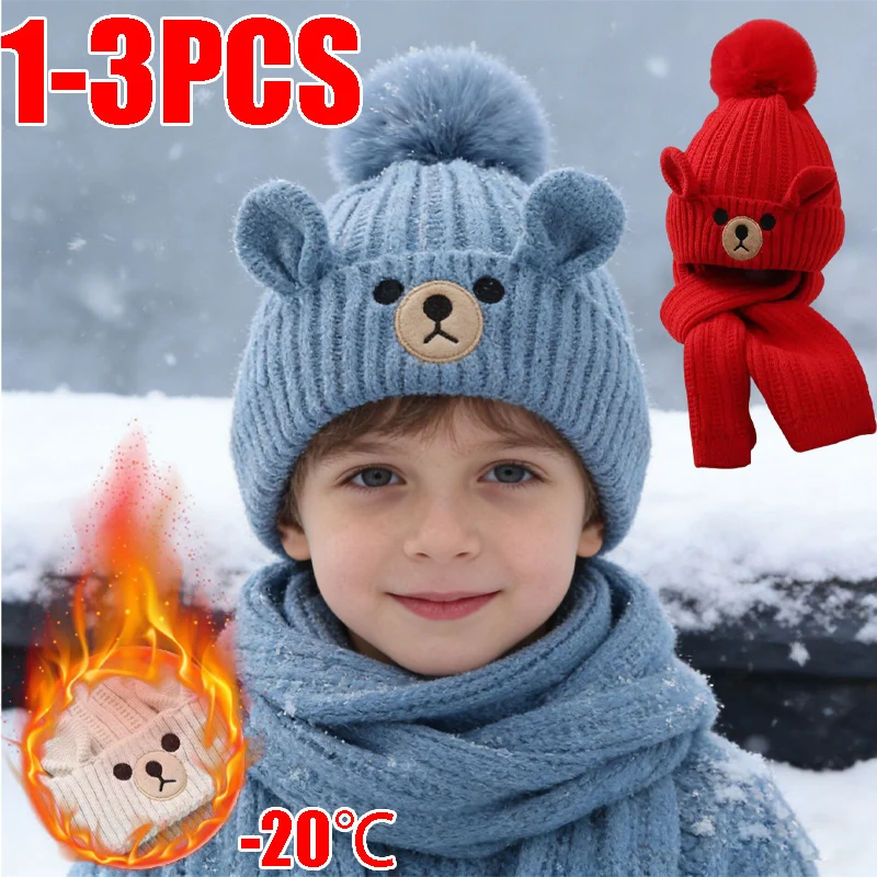 Winter-Wärme-Set für Kinder, gestrickt, mit Bärenohren, Mütze, Schal, Kombination mit Plüsch-Thermofutter, Stickerei-Akzenten für Unisex-Geschenke