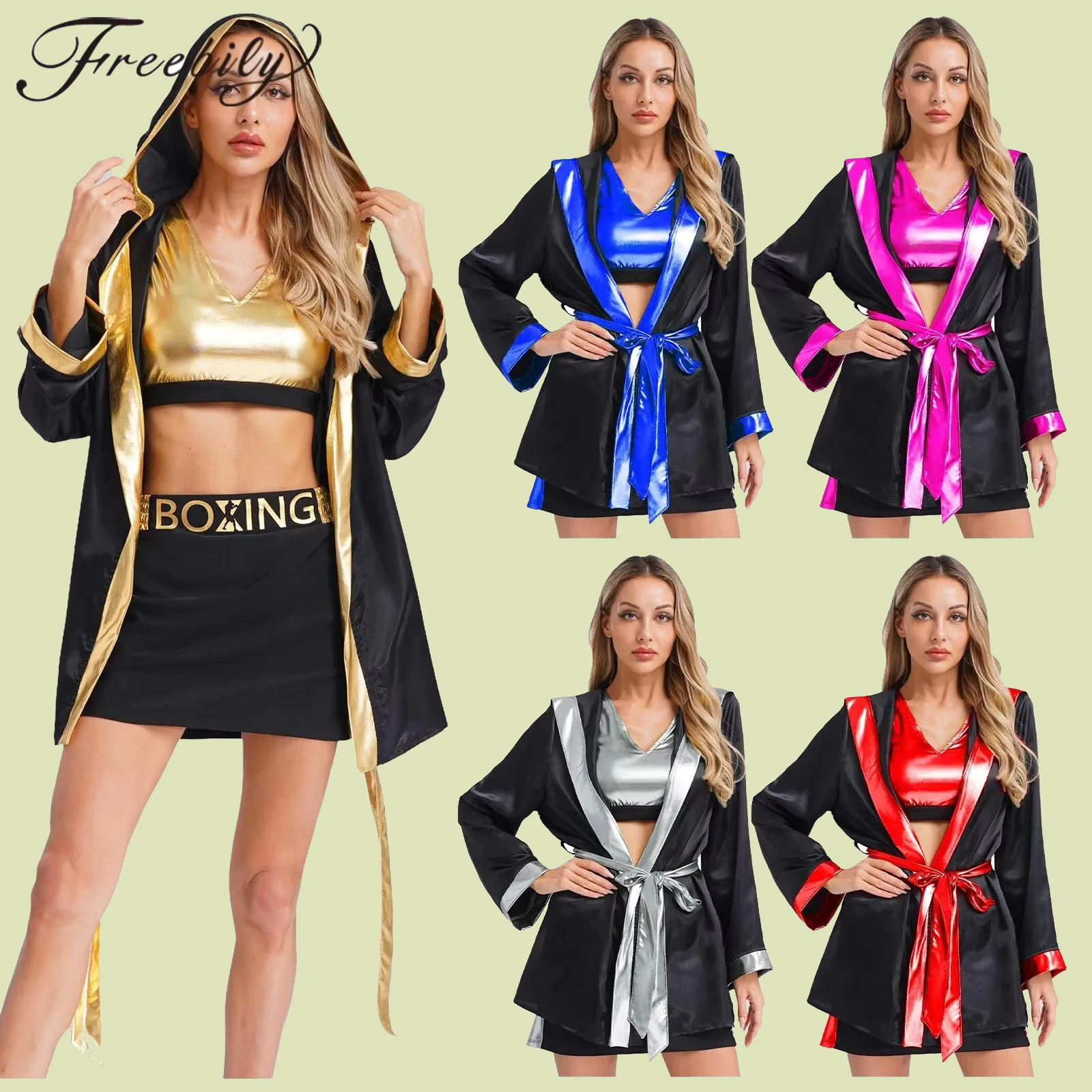 Frauen Boxen Roben Bjj Boxer Kampf Grappling Kostüm Kampfkunst Muay Thai Satin Tops + Rock Gürtel Kickboxen Mit Kapuze Outfit