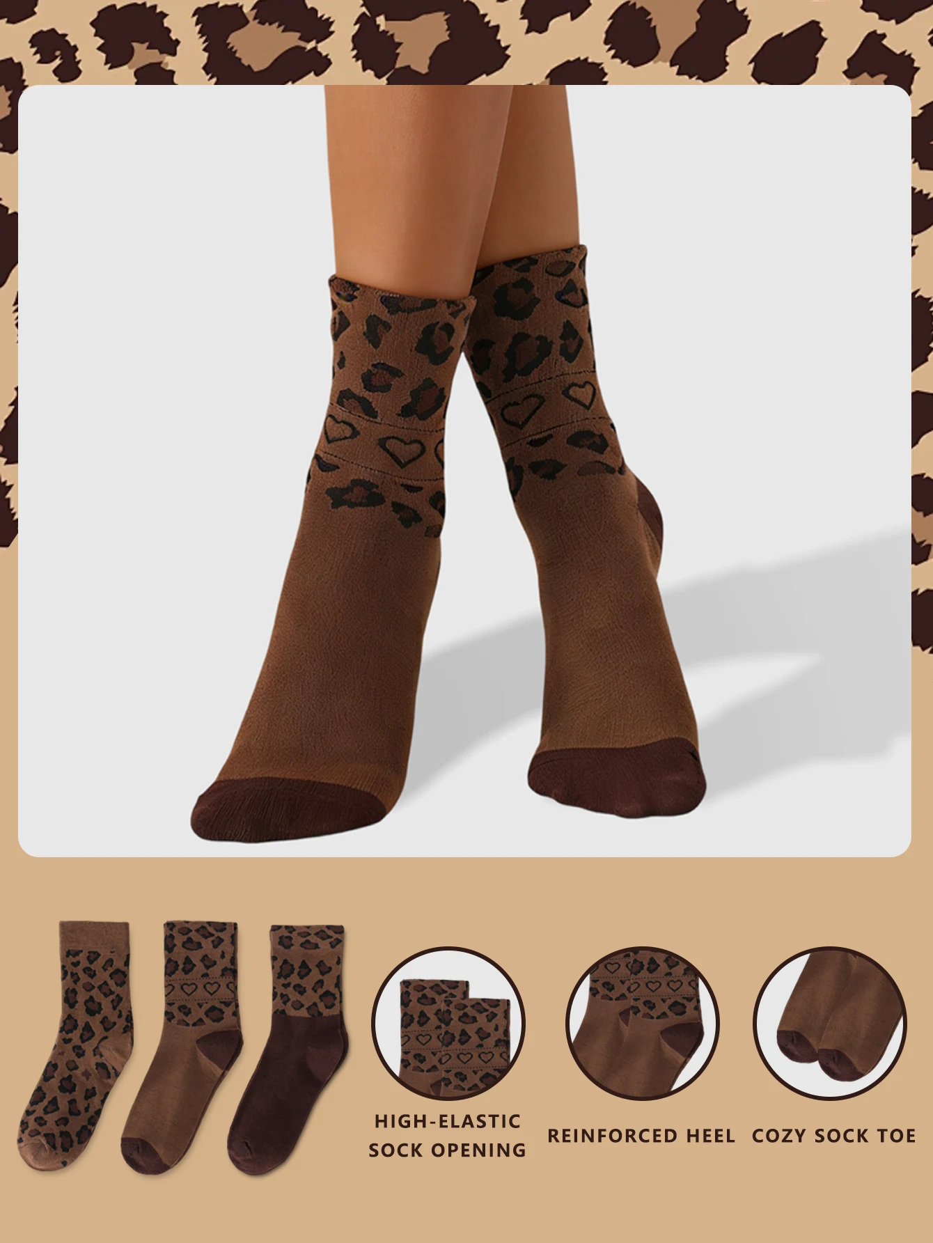 3 Paar Valentinstag-Socken mit Leopardenmuster für Damen, asymmetrische, mittelhohe Socken mit kaffeefarbenem Herz, lässige und modische Socken für den täglichen Gebrauch, schweißabsorbierend und atmungsaktiv
