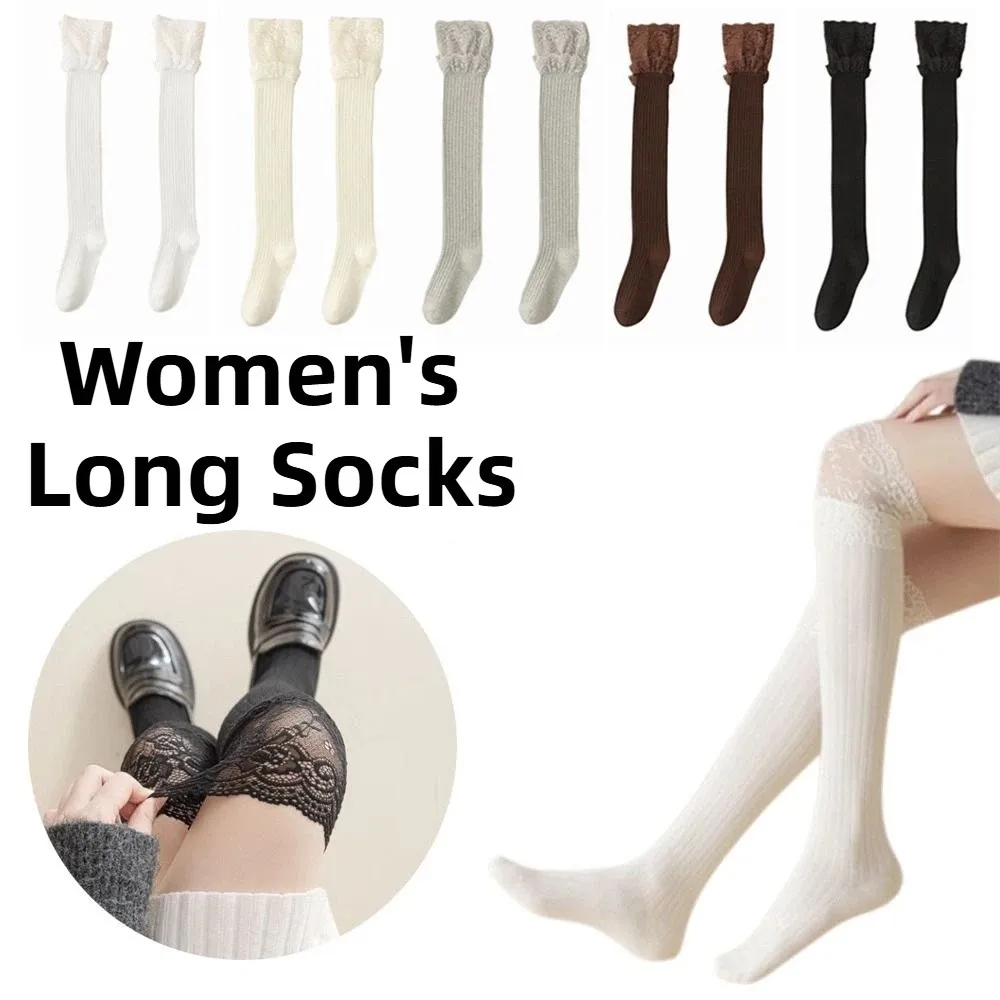 Trendige einfarbige lange Damensocken, weiche Spitzenbesatz-Strickstrümpfe, verdickte Overknee-Socken im Lolita-Stil