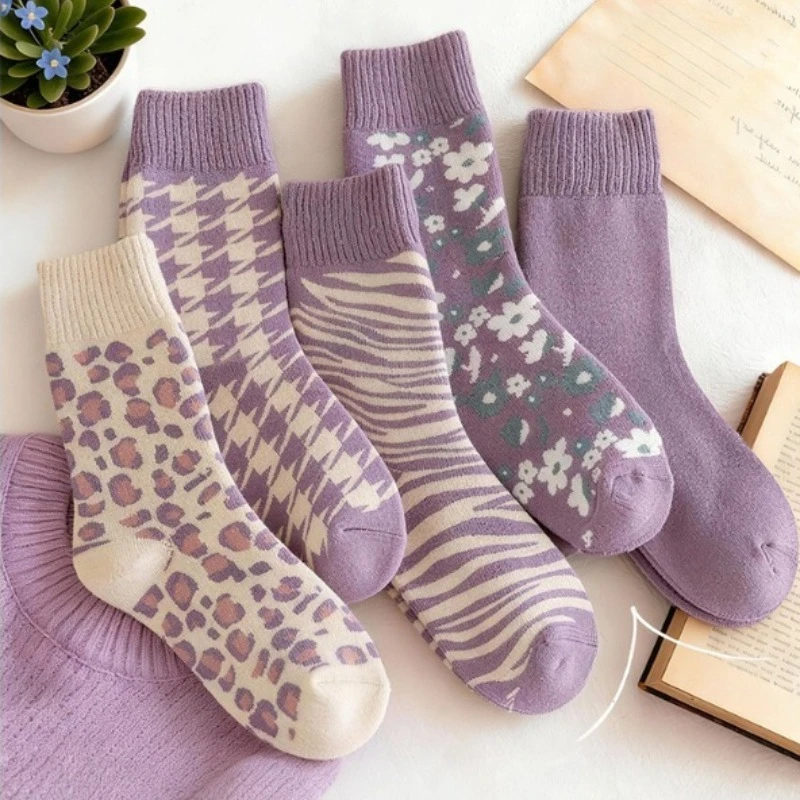 1/5 Paar Winter Neue Lila Schlaufensocken für Damen, Lange Wadensocken, Verdickte Version, Warme Schlafsocken, Mittellange Kälteresistente Socken für die Wochenbettzeit
