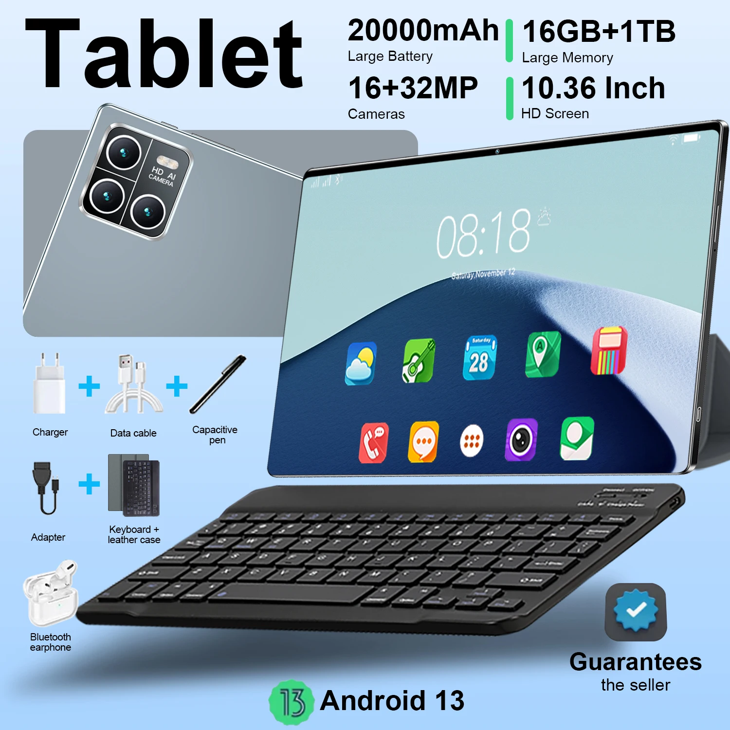 Android-Tablet, großer HD-Bildschirm, 10,36 Zoll, 16 GB RAM, 1 TB ROM, 20.000 mAh, Android 13,0, 14 Kerne Tablets, PC Typ-C, Dual-Kamera, 16 MP + 32 MP, Dual-SIM-Karte, Netzwerk, WIFI, Bluetooth, GPS, WPS, Bürogeschenke
