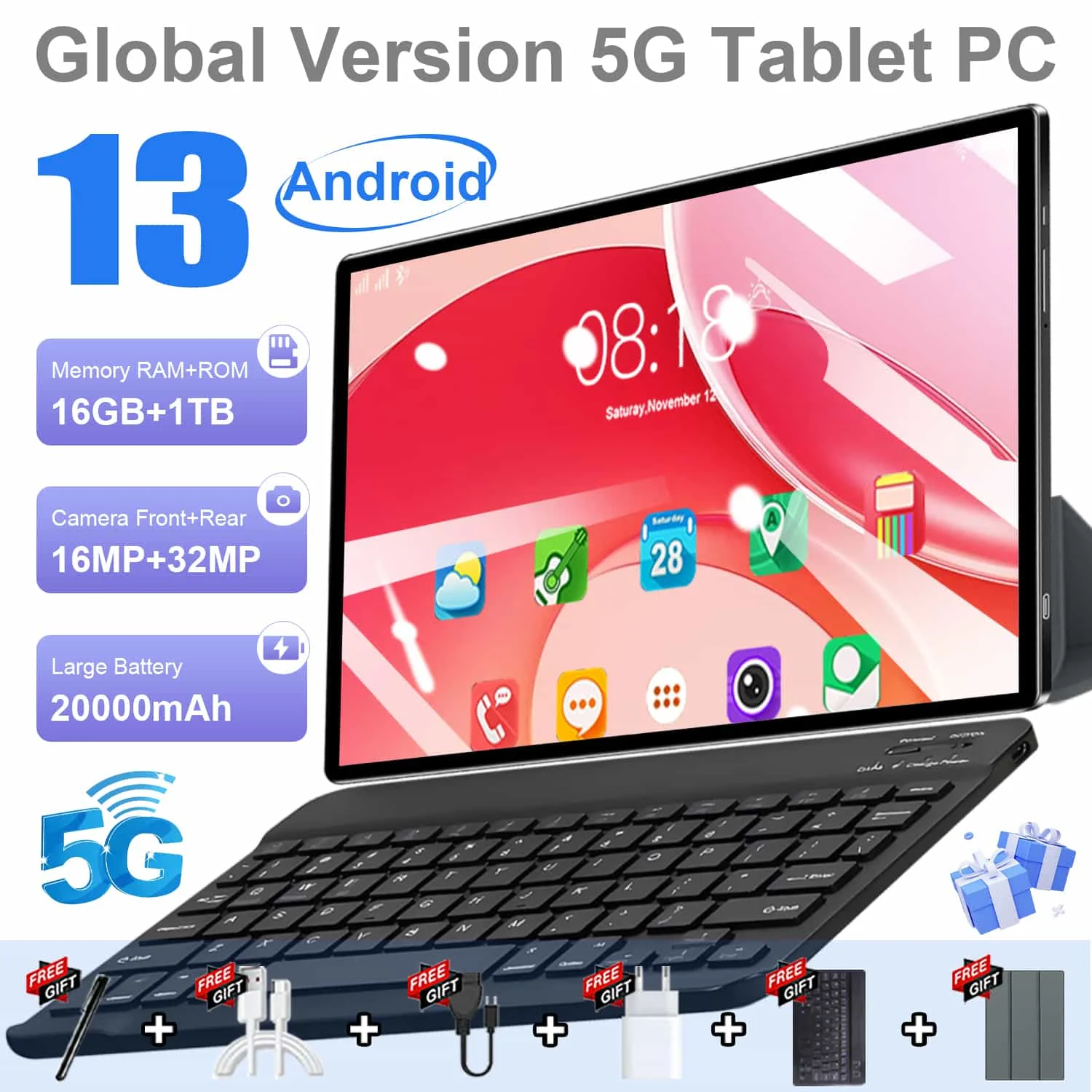 2026 5G High-End Android 13 Tablet 10,36" IPS Low-Blue-Light Adaptive Panel 16 GB + 1 TB Speicher 20000 mAh Langlebiger Akku WiFi BT