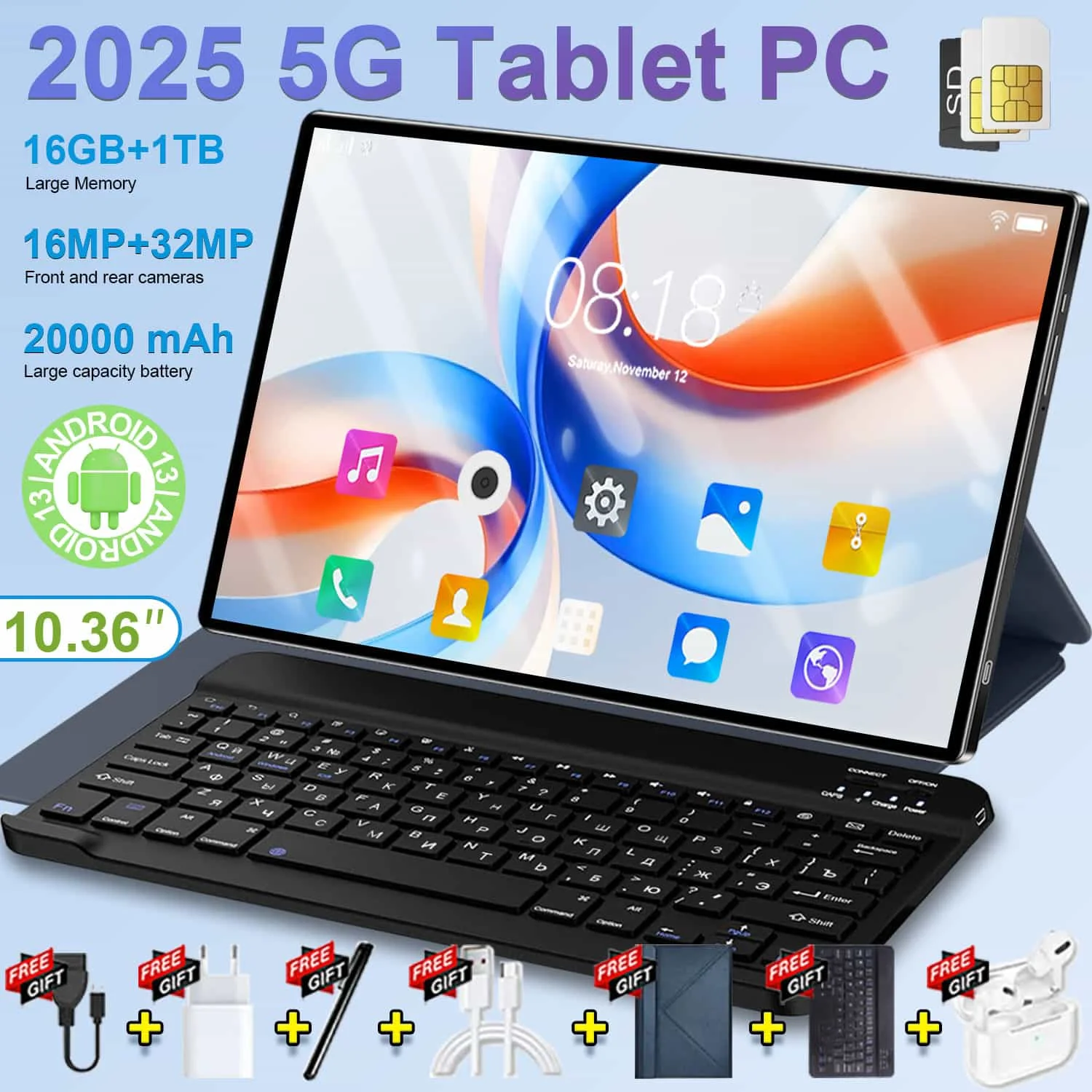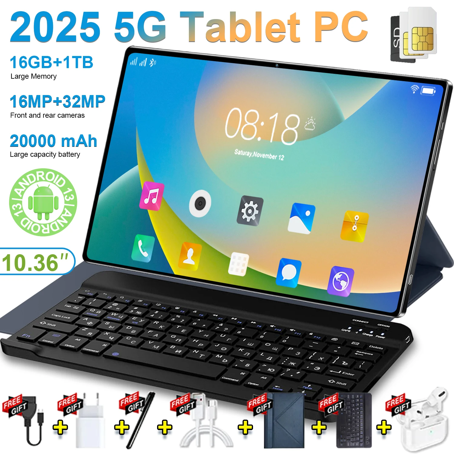 2025 Hochleistungs-5G-Tablet 10,36 Zoll Android 13 IPS-Display 16 GB + 1 TB Speicher 20000 mAh Akku WiFi BT für Geschäftsreisen, Studium