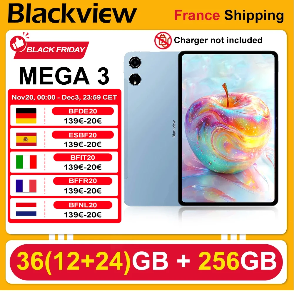 Blackview Mega 3 [Kein EU-Ladegerät] Tablet Android 15 8800 mAh 36 (12 + 24) GB + 256 GB 50 MP + 13 MP 12,1 Zoll FHD 90 Hz Dual SIM 4G 1080P IPS