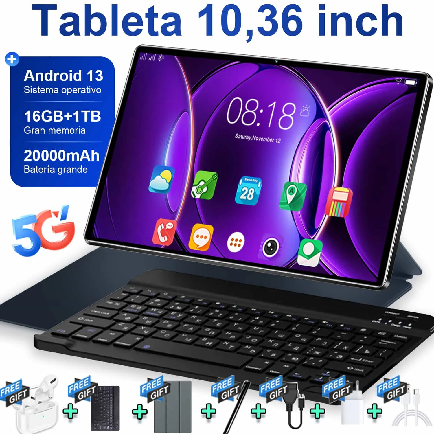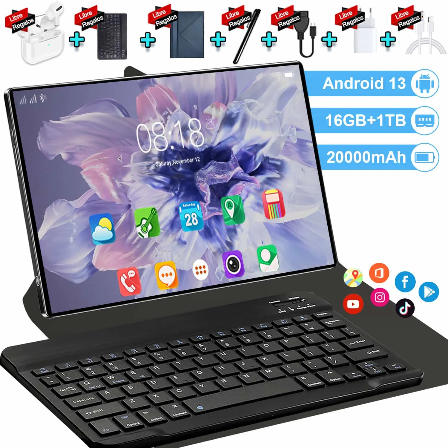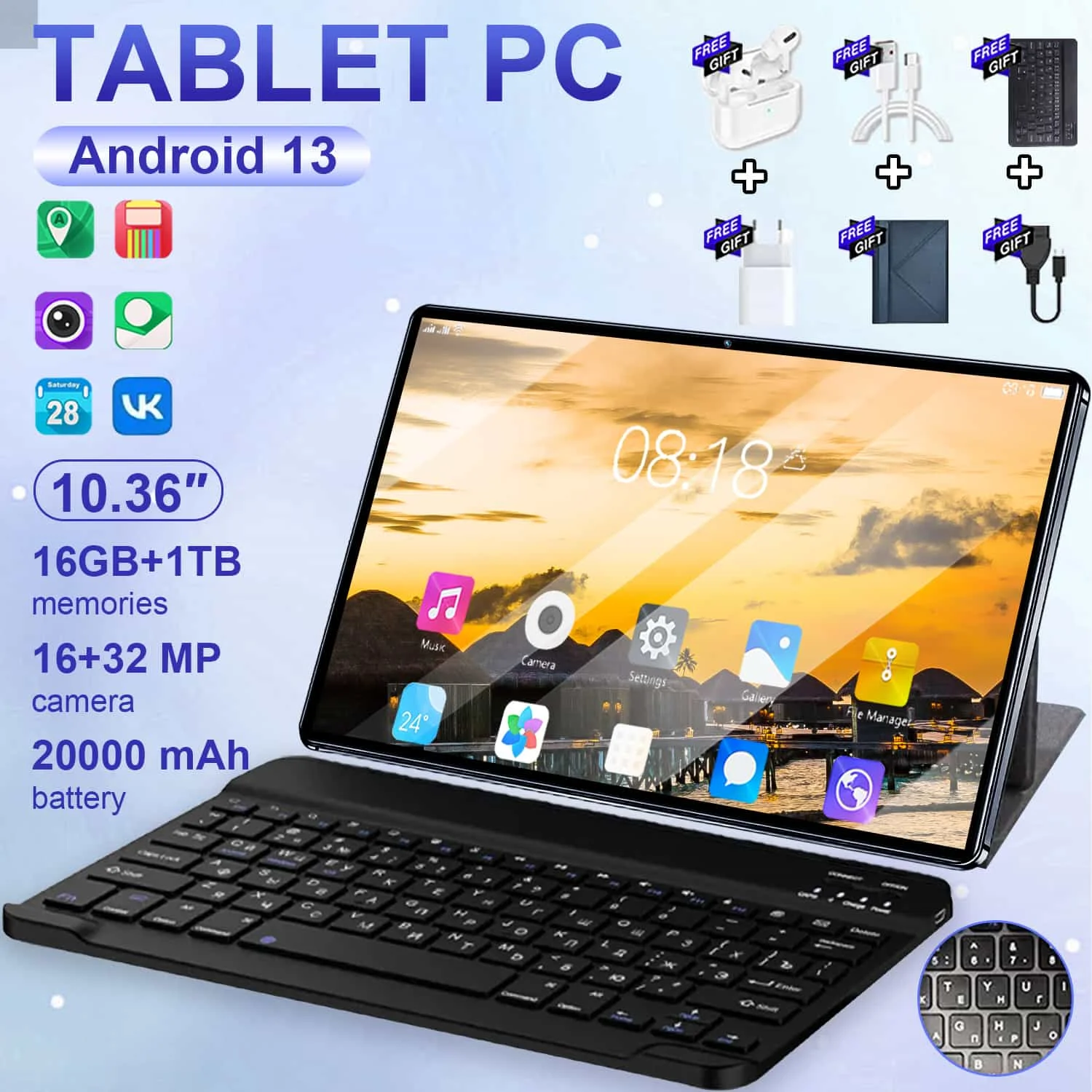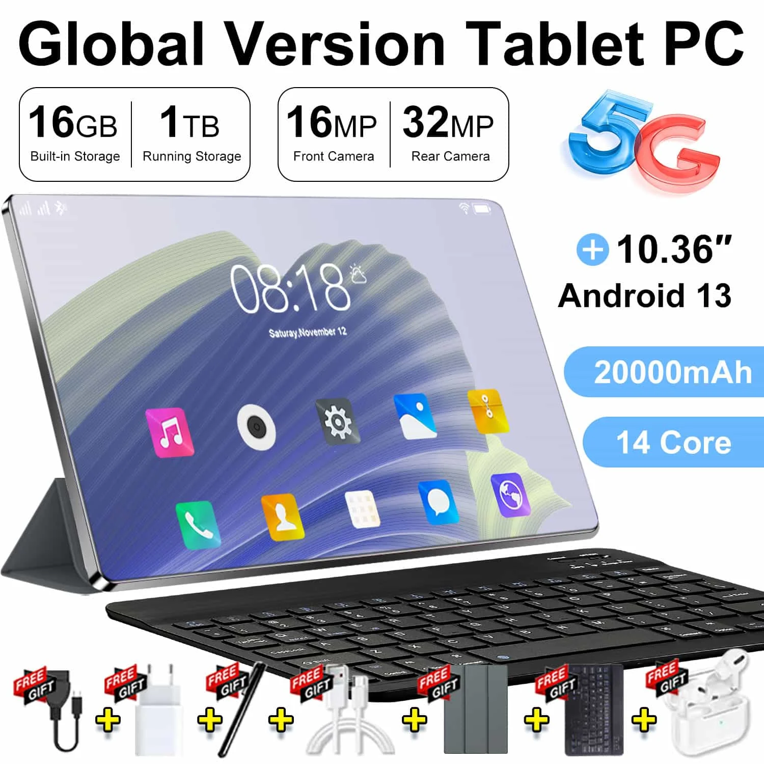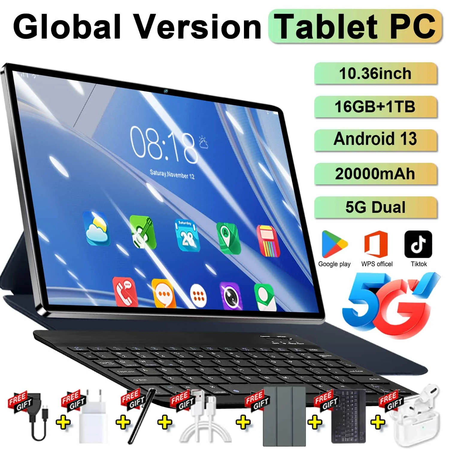 2026 5G Android 13 Tablet 10,36 Zoll 14-Core 16 GB 1 TB 4K HD Google Play Bluetooth WPS 5G LTE Double SIM WIFI 20000 mAh Tablets