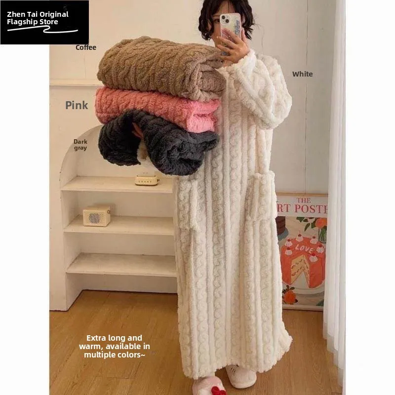 Neuer Langer Warmer Coral-Fleece Hausmantel für Damen, Deckenartiger Stil, Locker Geschnitten mit Taschen, Schlafkleid