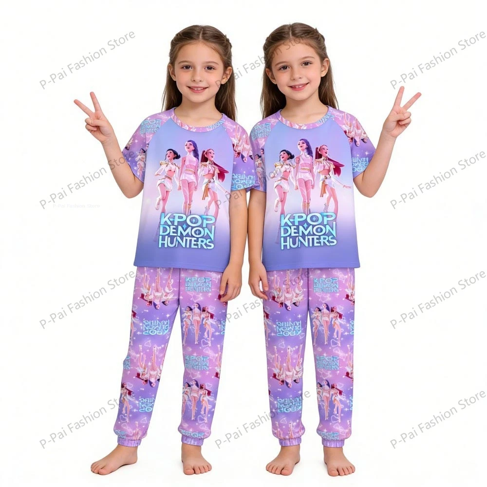 Kpop Demon Hunters Niedliches Pyjama-Set für Kinder, 2-teilig, kurzärmelige Nachtwäsche, Jungen und Mädchen, 3–14 Jahre, Kinder-Hauskleidung, Pyjama-Anzug
