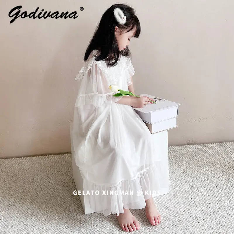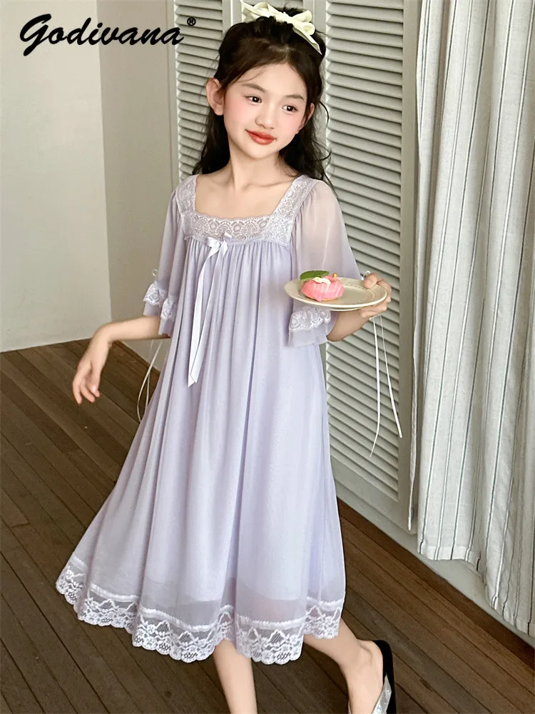 Mädchen Prinzessinnen-Kleid mit Spitze und Mesh-Einsatz 2026 Sommer Dünnes Eisseide-Kleid mit Kurzen Ärmeln V-Ausschnitt Lockerer Hofstil Mädchen-Nachthemden