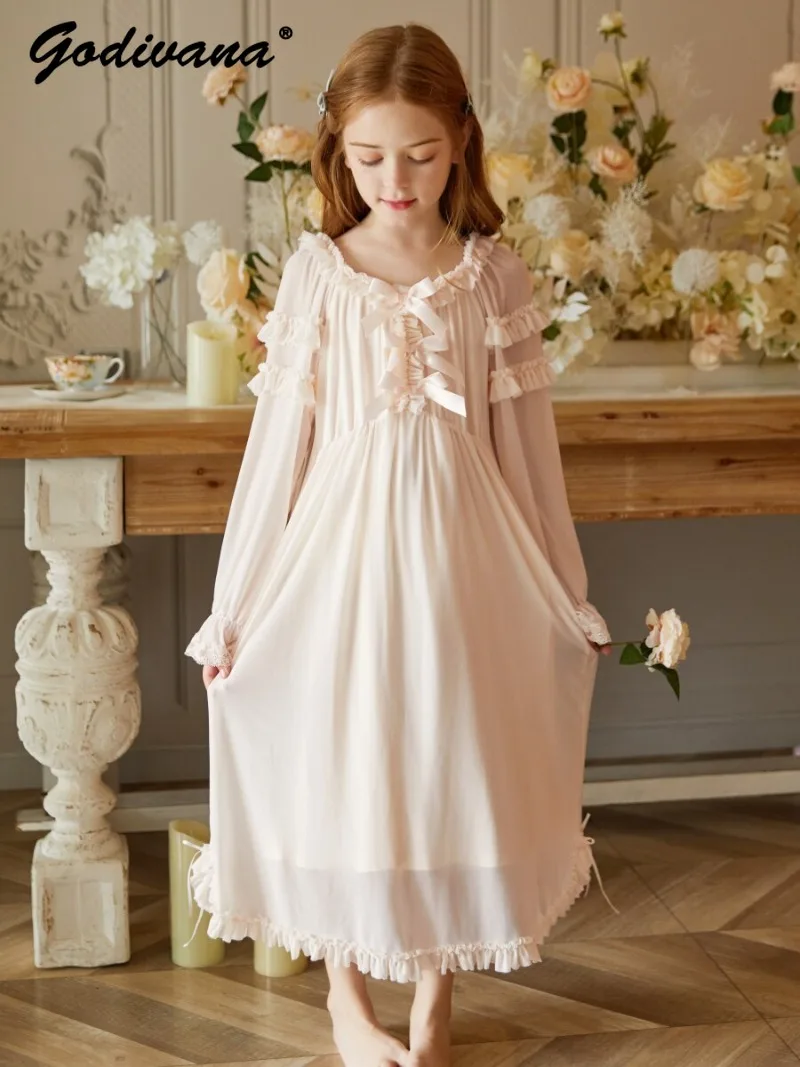 Mädchen Prinzessinnen-Nachthemd im Hofstil mit Langen Ärmeln, Süßes Mädchen-Nachthemd für Frühling und Sommer aus Reiner Baumwolle mit Feen-Schleife und Rüschen