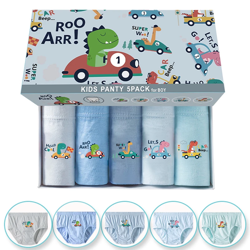 5 Stück/Set Kinder-Dreiecksunterwäsche aus weicher Baumwolle, Kinder-Dreieckshöschen mit Cartoon-Auto-Dinosaurier-Muster, atmungsaktive Slips für Jungen