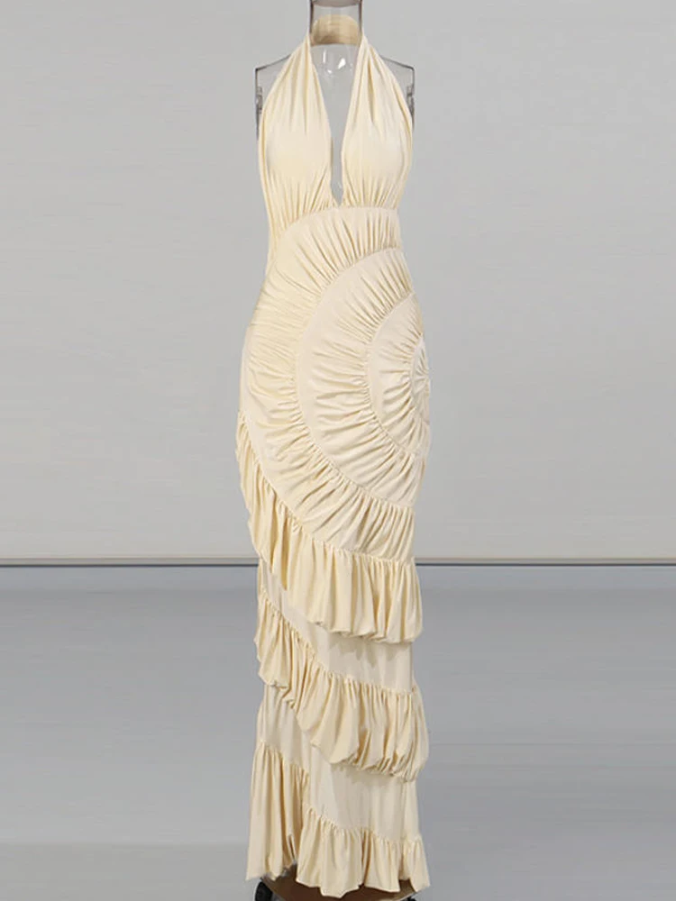 Schickes Aprikosenfarbenes Neckholder-Maxikleid für Damen Ärmellos Geraffte Taille Satin-Textur Mehrlagige Rüschen Kleider