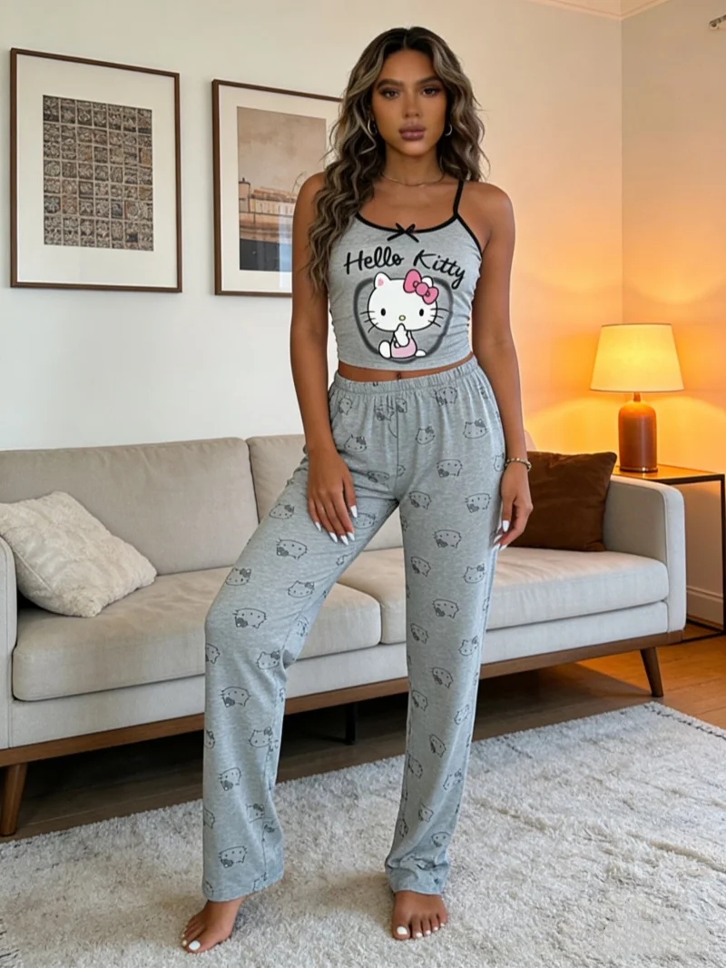 Hello Kitty koreanische Version des Sommer-Pyjama-Sets, Sling-Weste, Hose, zweiteiliges Loungewear-Set im ausländischen Stil mit Cartoon-Print