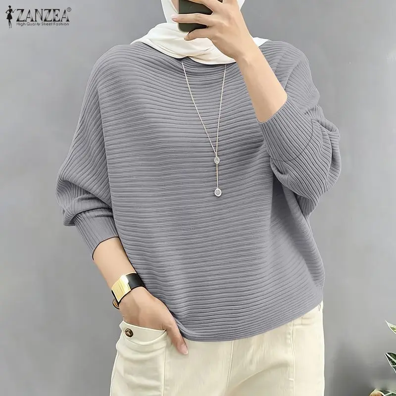 ZANZEA Muslimische Damen Casual Gerippte Strickblusen Frühling Langarm Lose T-Shirts O-Ausschnitt Einfarbig Islamische Hijabs Bescheidene Oberteile