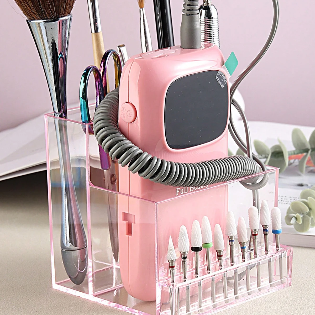 Ein kompakter Halter und Organizer für Mini-Nagelbohrer, für Nagelpolierwerkzeuge, mit einer Aufbewahrungsbox und einem Präsentationsständer
