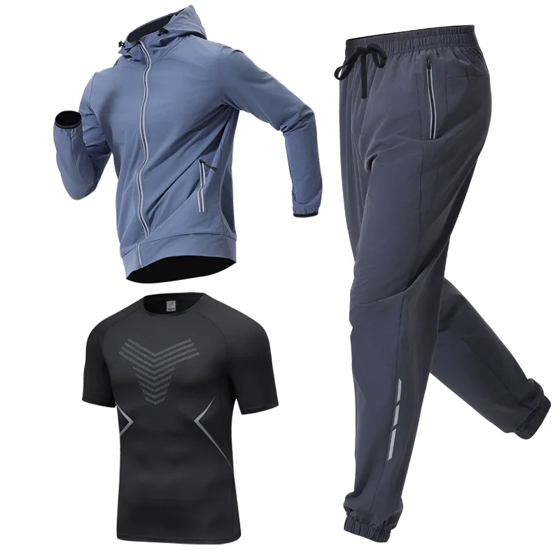 Herren 3-Teiliges Lauf-Trainingsset mit Kapuzenpullover Atmungsaktives Schweißableitendes Sportoutfit Lange Hose Kurzarm