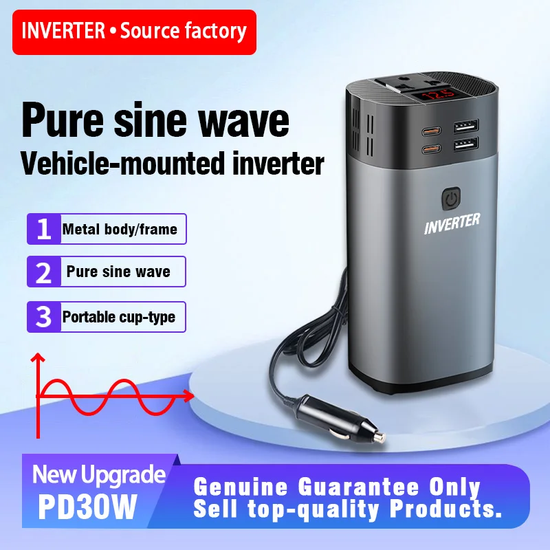 200 W reiner Sinus-Auto-Wechselrichter, 12 V auf 110 V, 220 V-Konverter mit Typ-C PD30W Schnelllade-Auto-Feuerzeug-Port-Adapter aus Metall