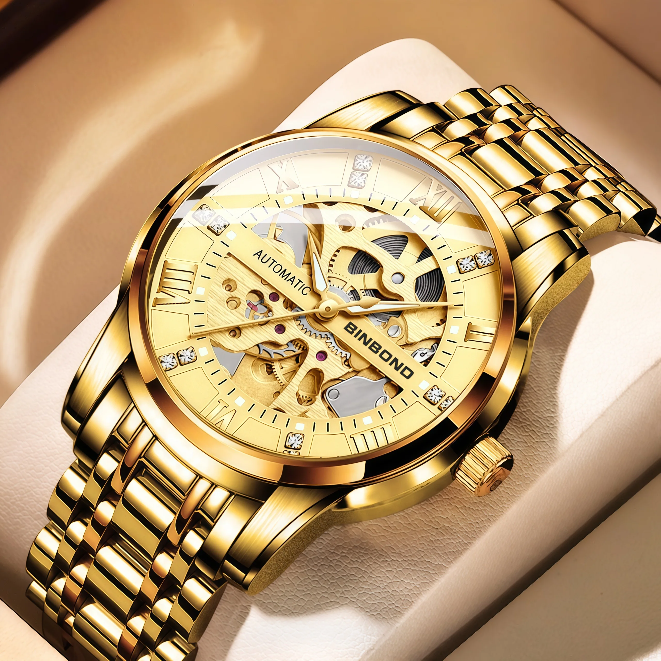 BINBOND Business Herrenuhr, vollautomatisch, mechanisch, mit Leuchtanzeige, 30 m wasserdicht, Festival- und Geburtstagsgeschenk