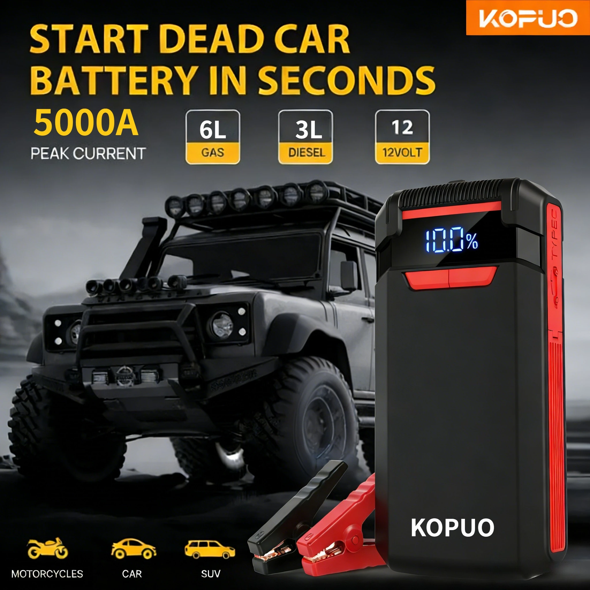 KOPUO Auto-Starthilfe Powerbank Spitzenstrom 5000A Tragbarer Auto-Booster Notfall-Batterieladegerät 12V Startgerät