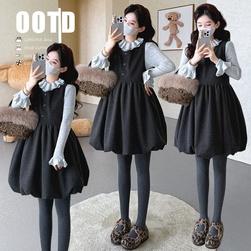 Umstandskleid Frühling Herbst 2026 Neuer Stil Süßes Niedliches Polka-Dot-Kleid und Rüschenpullover Zweiteiliges Set für Schwangere