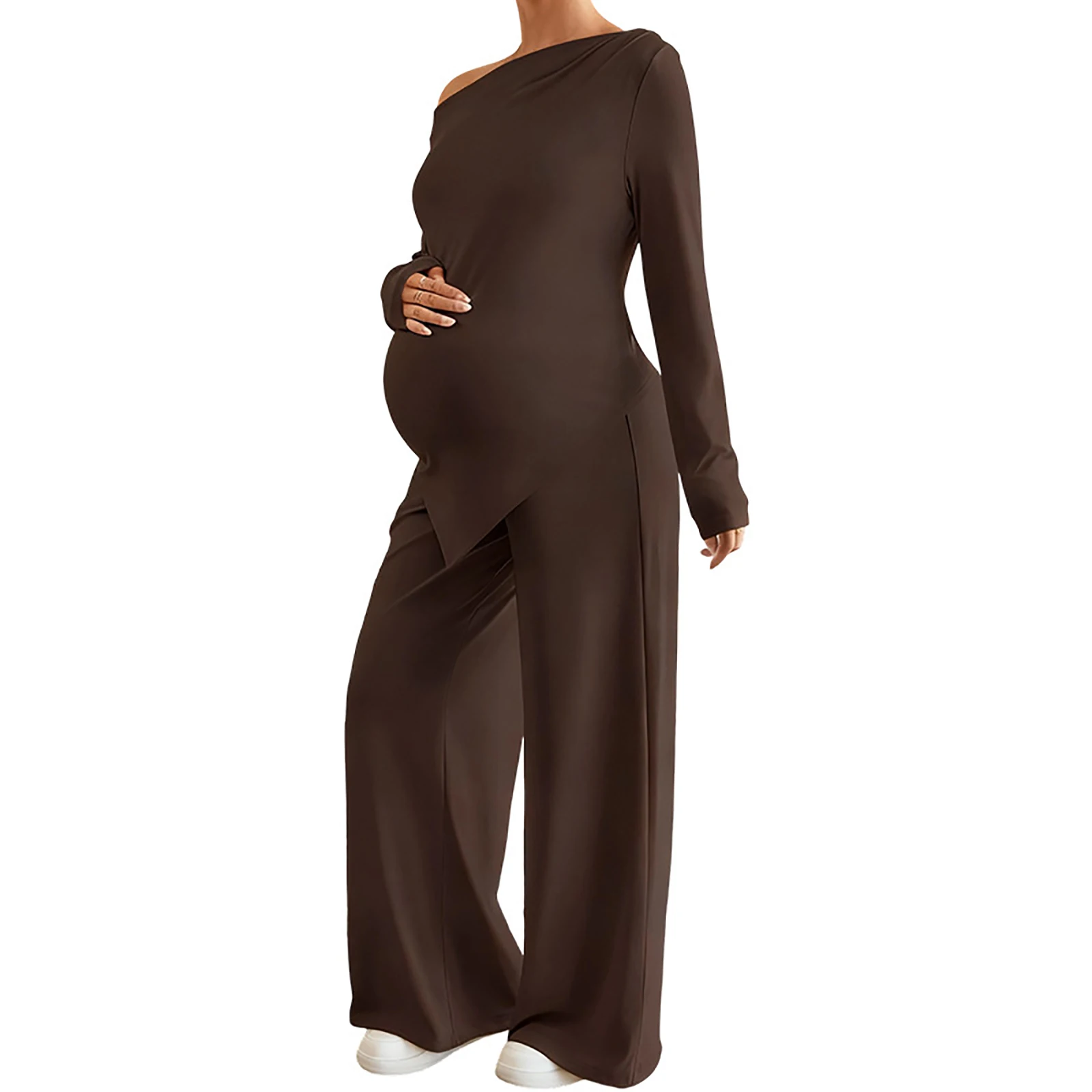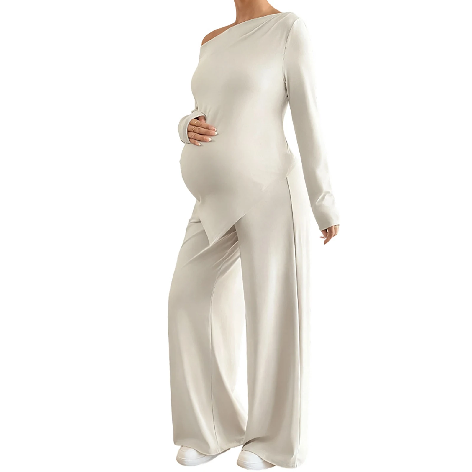 Modisches Freizeitoutfit für schwangere Frauen, asymmetrischer Saum, Oberteile mit verstellbarer Taille, lockere Hose mit geradem Bein, Frühlings- und Herbstkostüm