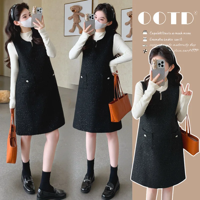 High-End-Mode für Schwangere, 2025, Herbst, koreanischer Stil, Spitze, Krawatte, geknöpft, Pullover, Weste, Kleid und Langarm-Basis-Top-Set