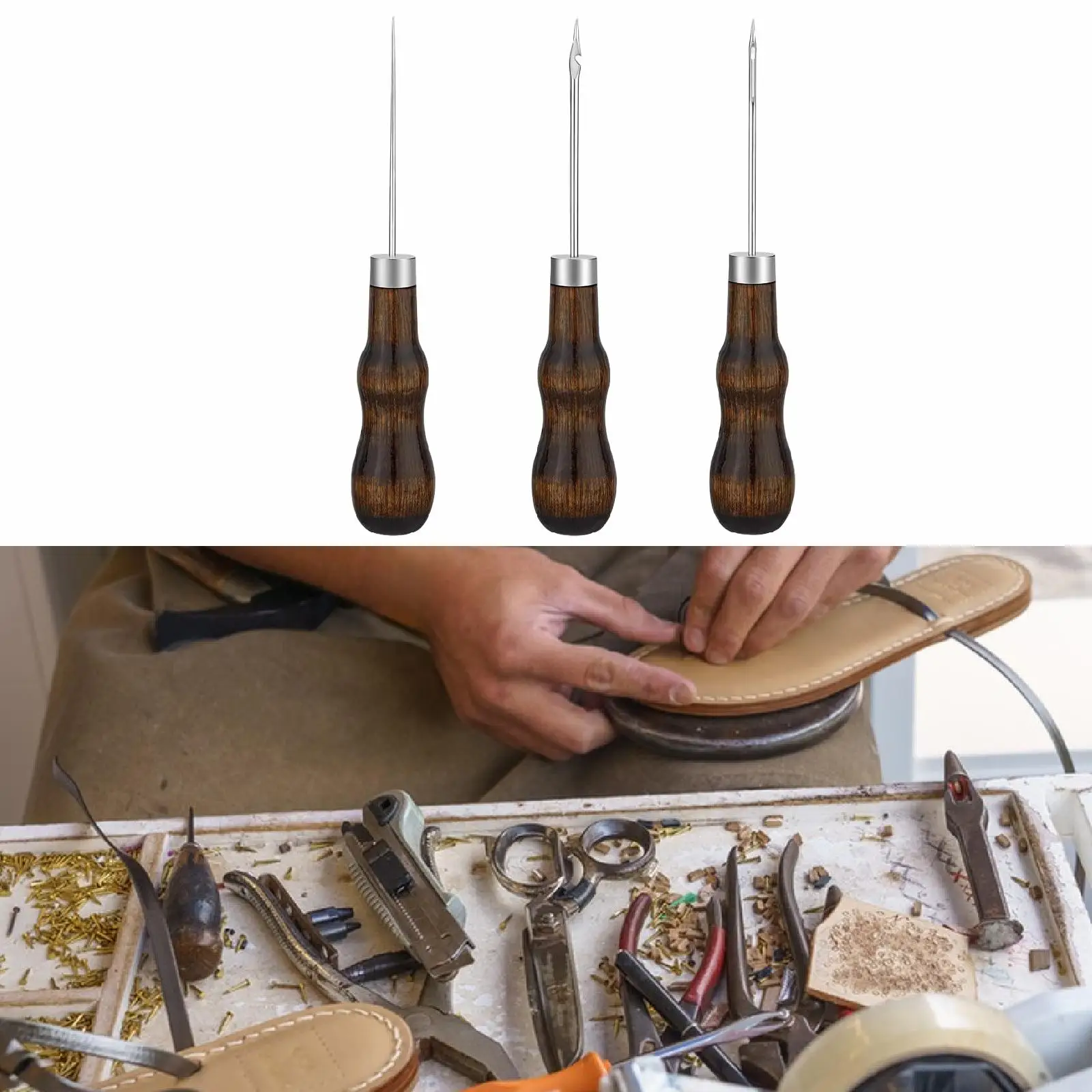 3x Nähahle aus Holz mit Griff, vielseitiges Werkzeug zum Lederreißerarbeiten und zum Bohren von Löchern