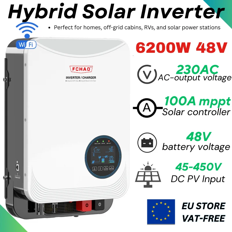 FCHAO 6,2 kW 48 V netzunabhängiger Hybrid-Solarwechselrichter V 50 Hz EU reiner Sinus, 7,2 kW MPPT 90 A PV 500 VDC, 80 A AC-Ladegerät 100 A gemischt, USV