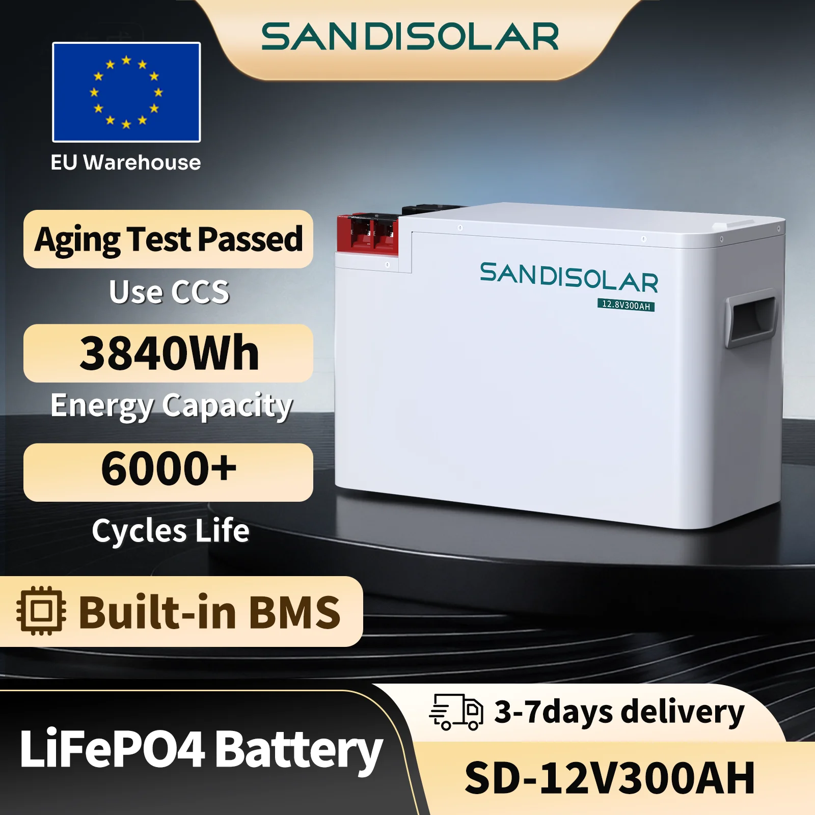 SANDISOLAR 12V 300Ah Lithium LiFePO4 Batteriepack, 3kWh 200Ah, mit 200A BMS, 6000+ Zyklen, für Solaranlagen