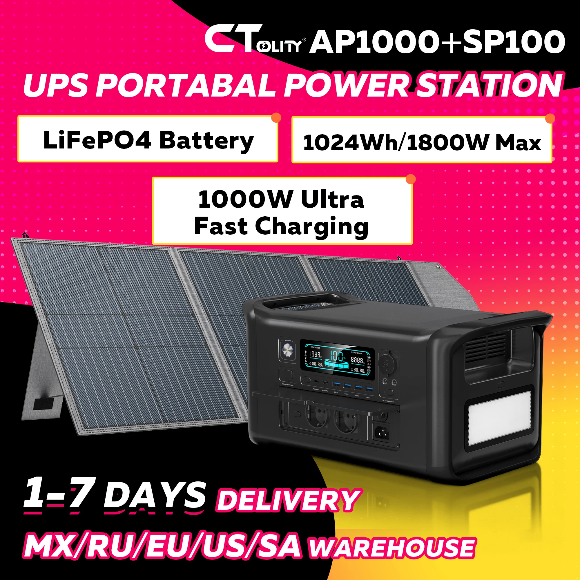CTOLITY Tragbarer Solargenerator 1800W mit 100W Solarpanel, Stromstation mit LiFePO4-Batterie 1024Wh 1600W (110V) und UPS-Funktion, Notstromversorgung für zu Hause und Powerbank für Outdoor-Camping