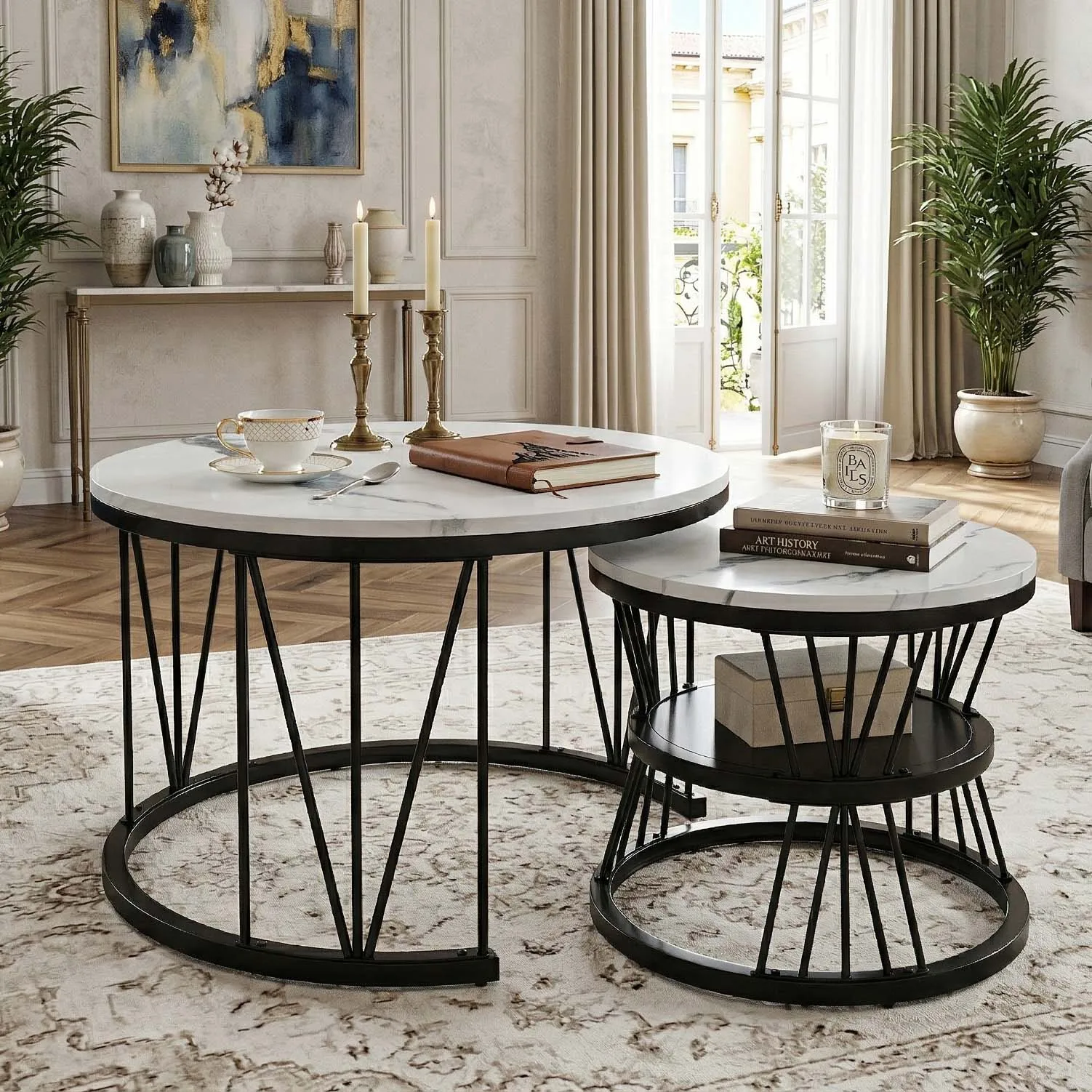 70 cm + 45 cm, runde Tische mit weißem Marmoreffekt, schwarze Metallstruktur, V-Set, 2 Ebenen mit Stauraum