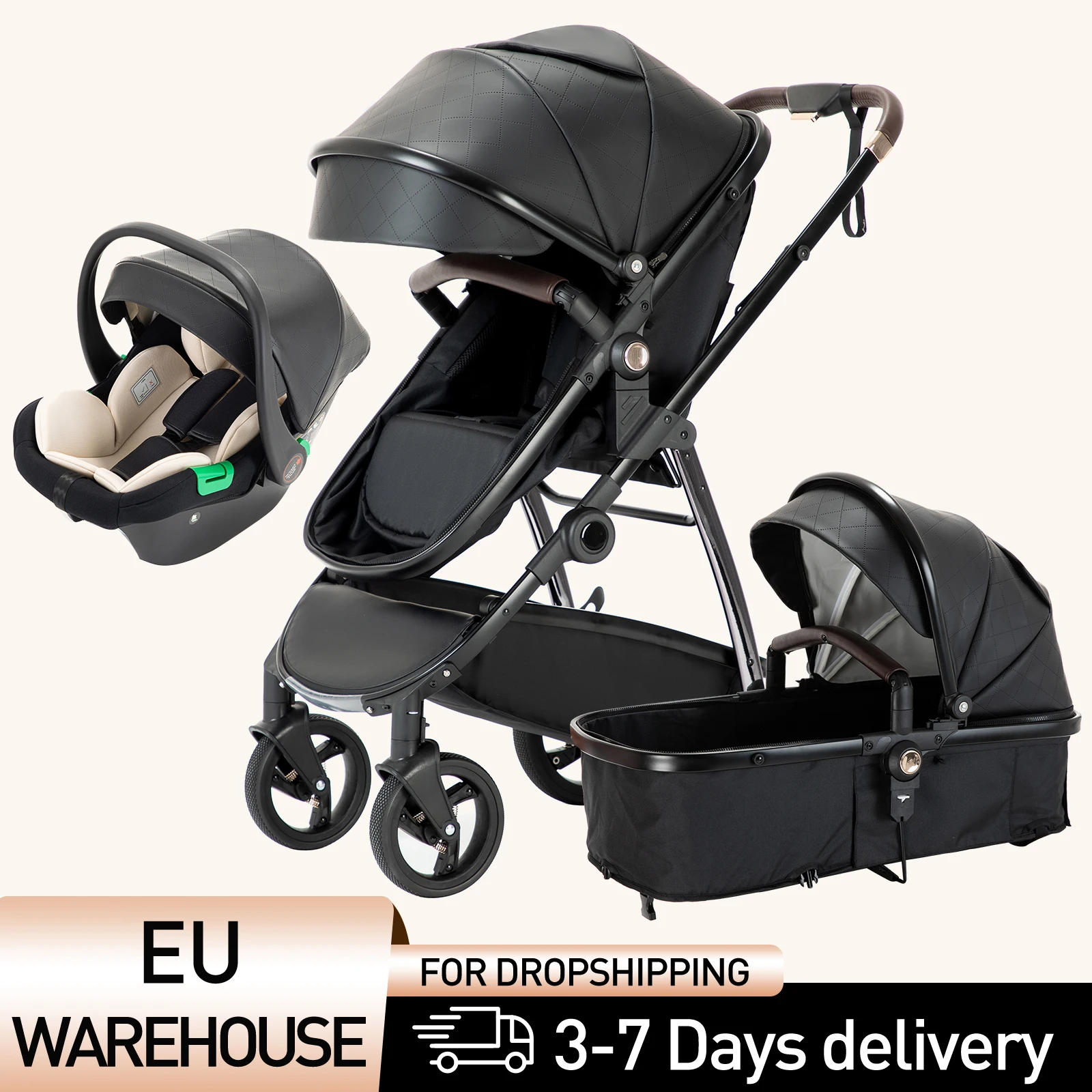 3-in-1 Baby-Kinderwagen, tragbarer, luxuriöser Reisekinderwagen, Hochlandschafts-Klappkinderwagen, Aluminiumrahmen, PU-Leder