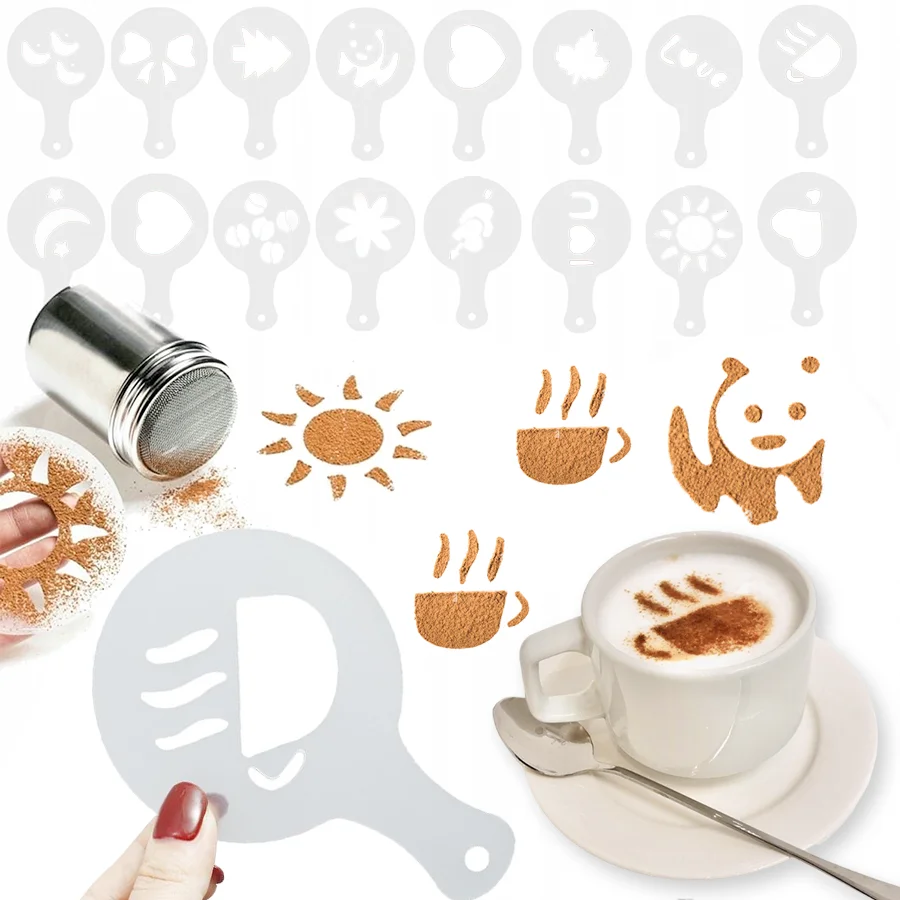 1 Stück Edelstahl Schokoladenstreuer Kakaomehl Kaffeesieb oder 16/19 Stück Kaffeeschablonen Vorlage Strew Pad Duster Spray Set