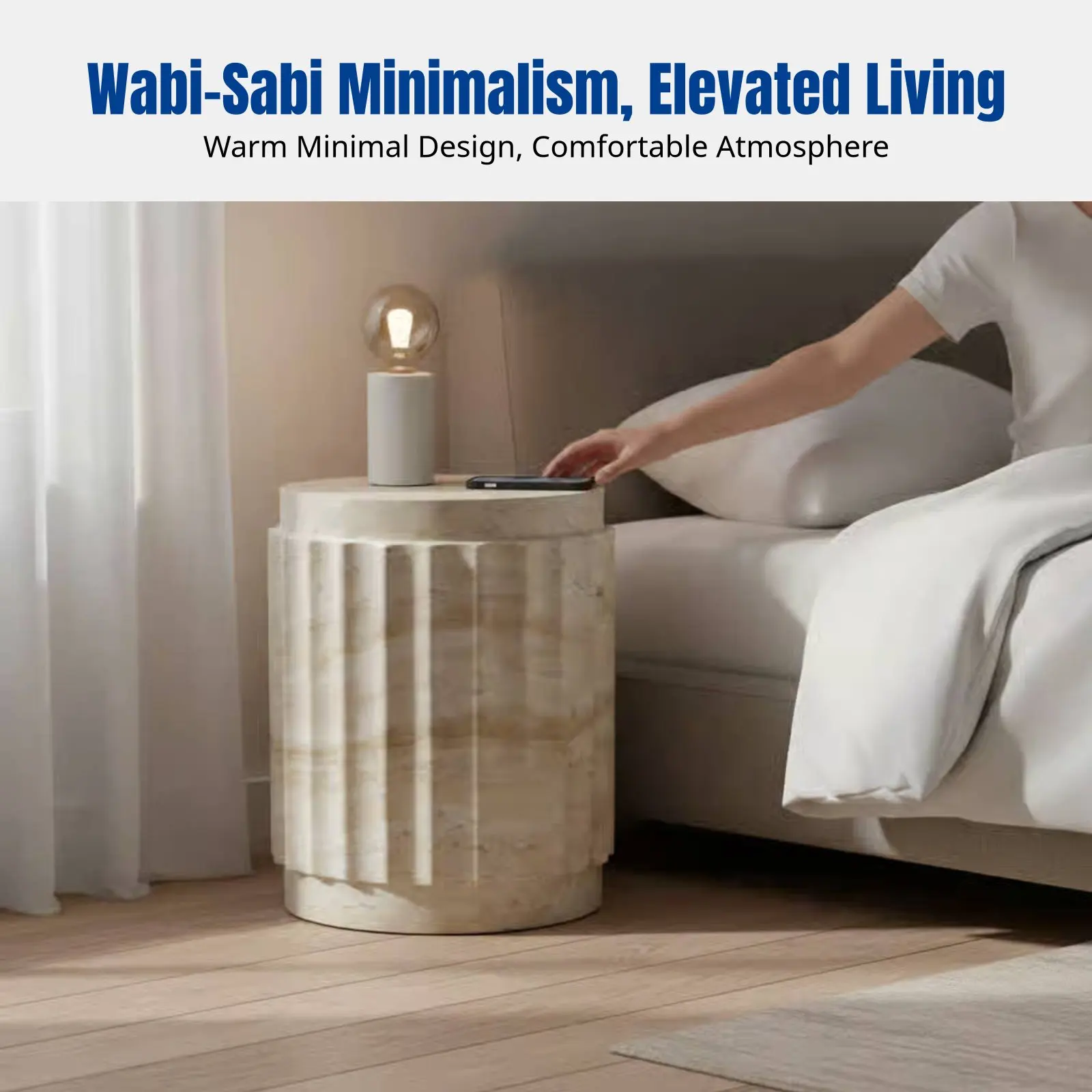Moderner Minimalistischer Beistelltisch in Travertin-Optik, Runder Couchtisch, Nachttisch mit Oxid-Finish, Neutraler Sandton