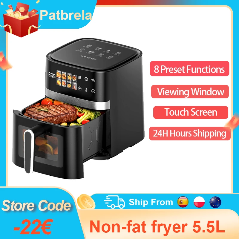 Patbrela 5,5L Heißluftfritteuse 8-in-1 Max 200 ° C Elektrischer Heißfritteuse-Ofen, ölfreier Herd mit Touch-Steuerung, antihaftbeschichtetem Korb und sichtbarem Fenster