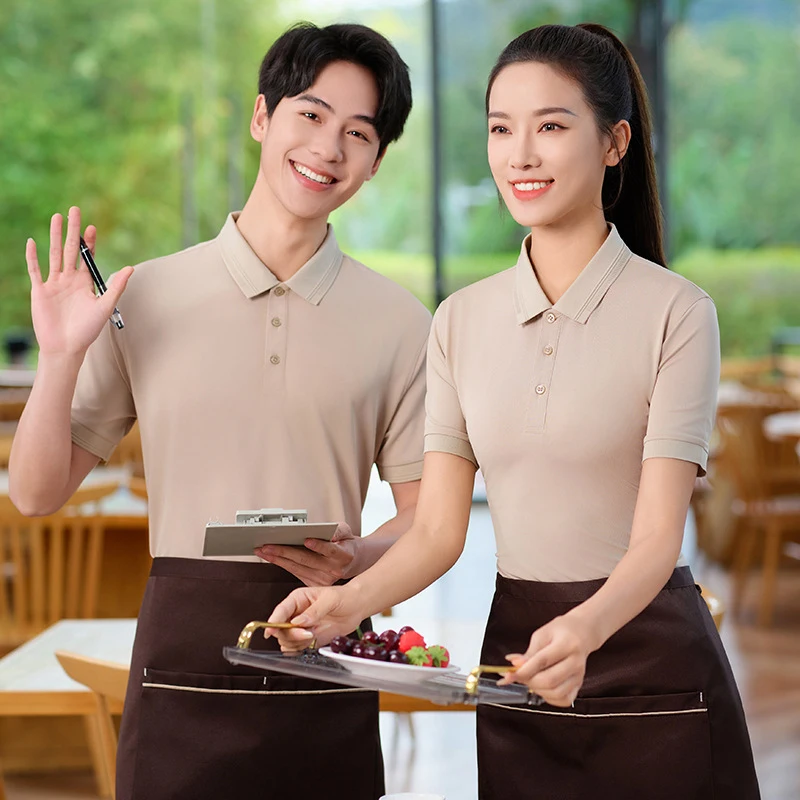 Kurzärmelige Restaurant-Arbeitskleidung, Poloshirt mit Logodruck, bestickte Arbeitskleidung für Milchtee-Läden und Supermarkt-Servicepersonal.