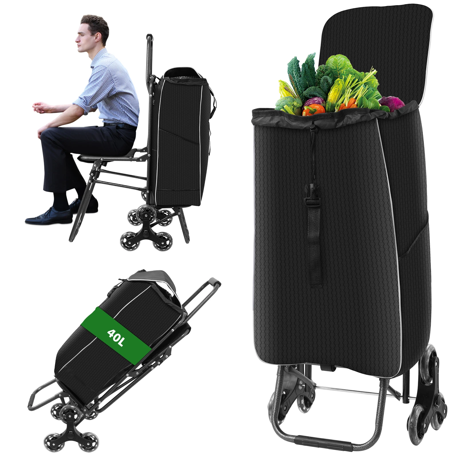 Tragbarer 40-Liter-Einkaufswagen mit Stuhl, dreieckige Räder, Einkaufswagen, zusammenklappbarer Lebensmittel-Hilfswagen, Tasche für Oberladung