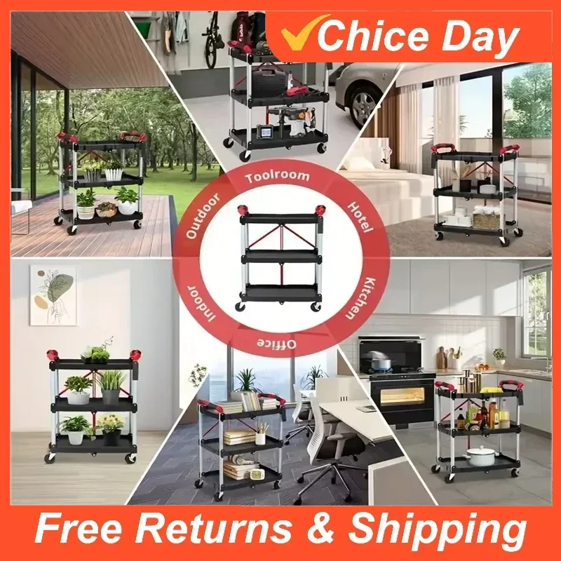 Multifunktionaler dreischichtiger faltbarer Servierwagen aus Kunststoff mit Rädern zur Aufbewahrung und Organisation von Autos