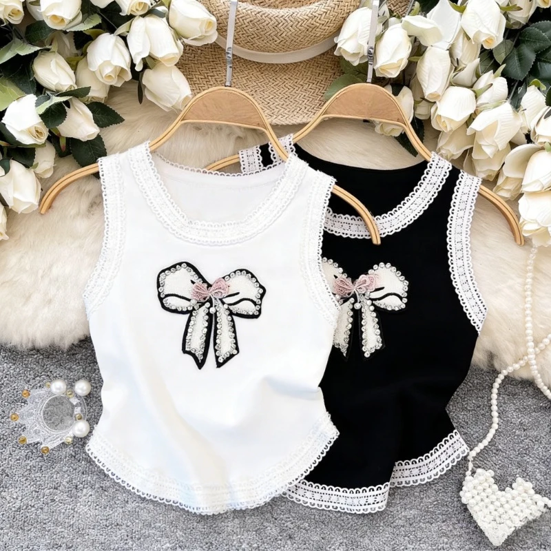 Weißes Spitzenbesetztes Strass-Schleifen-Crop-Top Damenbekleidung Ärmellose Weste Rundhals Dehnbares Strick-Casual-Sommer-Cami-Top Outfit