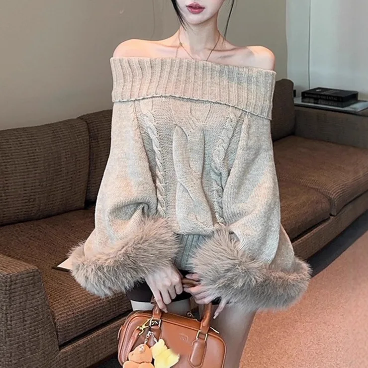 Khaki Off-Shoulder Pullover mit Haarzopfmuster und langen Ärmeln im Spicy-Girl-Stil, vielseitiges, dünnes Oberteil
