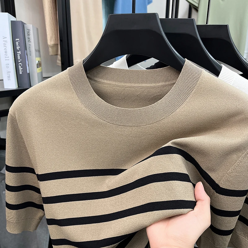 Hochwertiges Vintage-Streifenstrickshirt für Herren, Rundhals-Kurzarm-T-Shirt, Edles Casual-Oberteil, Sommer-Trend
