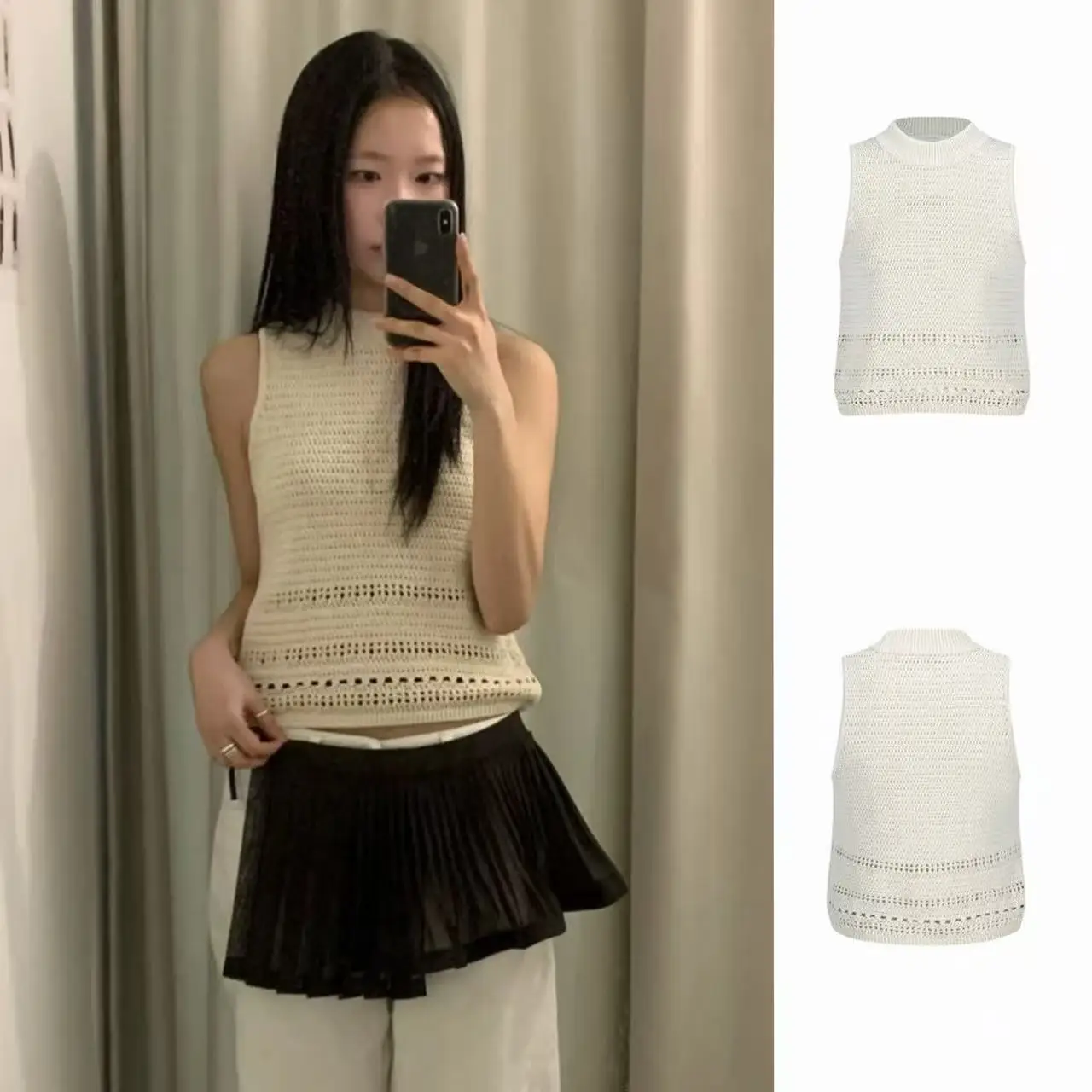 Dongdaemun Kurze Strickweste mit ausgehöhltem Design im koreanischen Stil, locker sitzender Pullover mit Rundhalsausschnitt, Damenmode für den Frühling